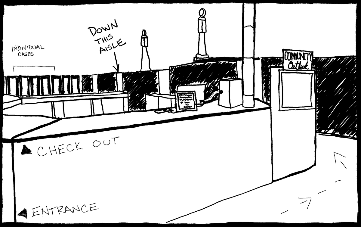We are halfway down the 4th aisle, left of the green Sinclair gas pump. You'll find us on the right side.